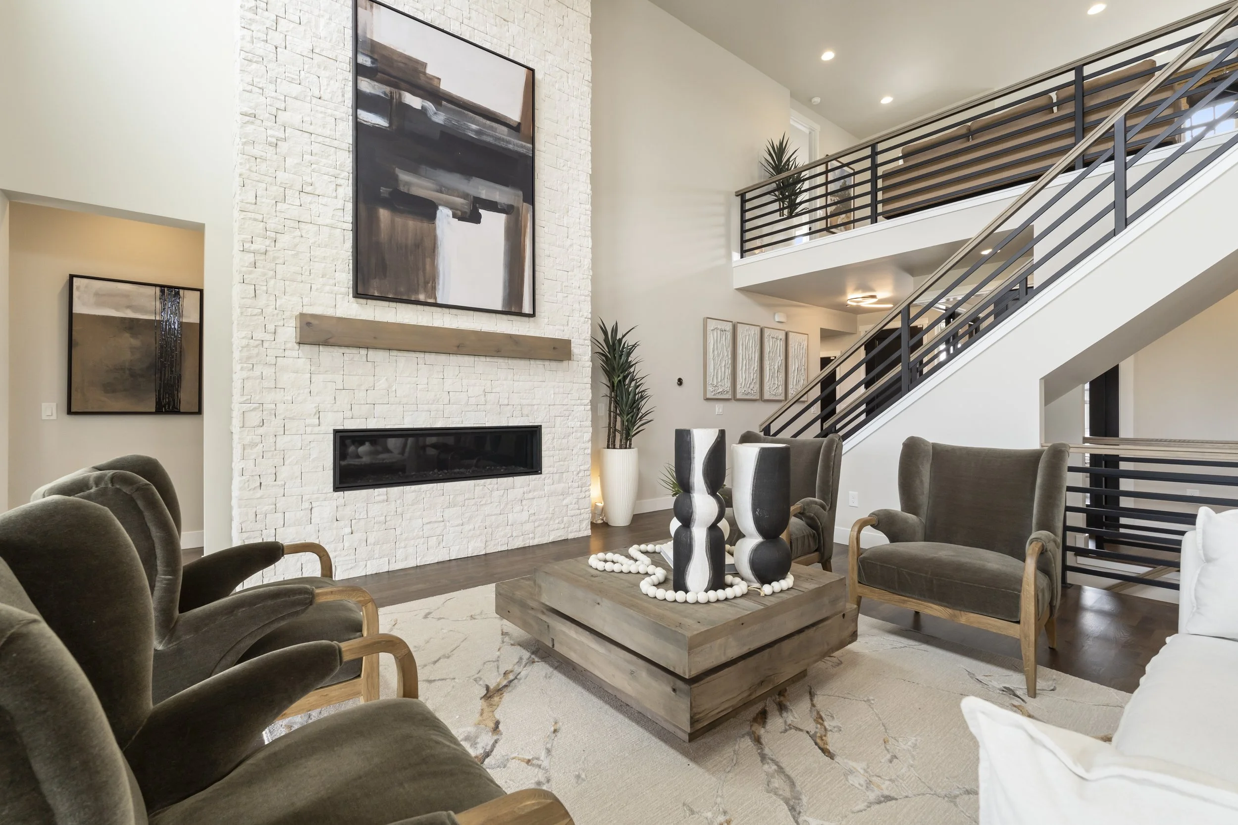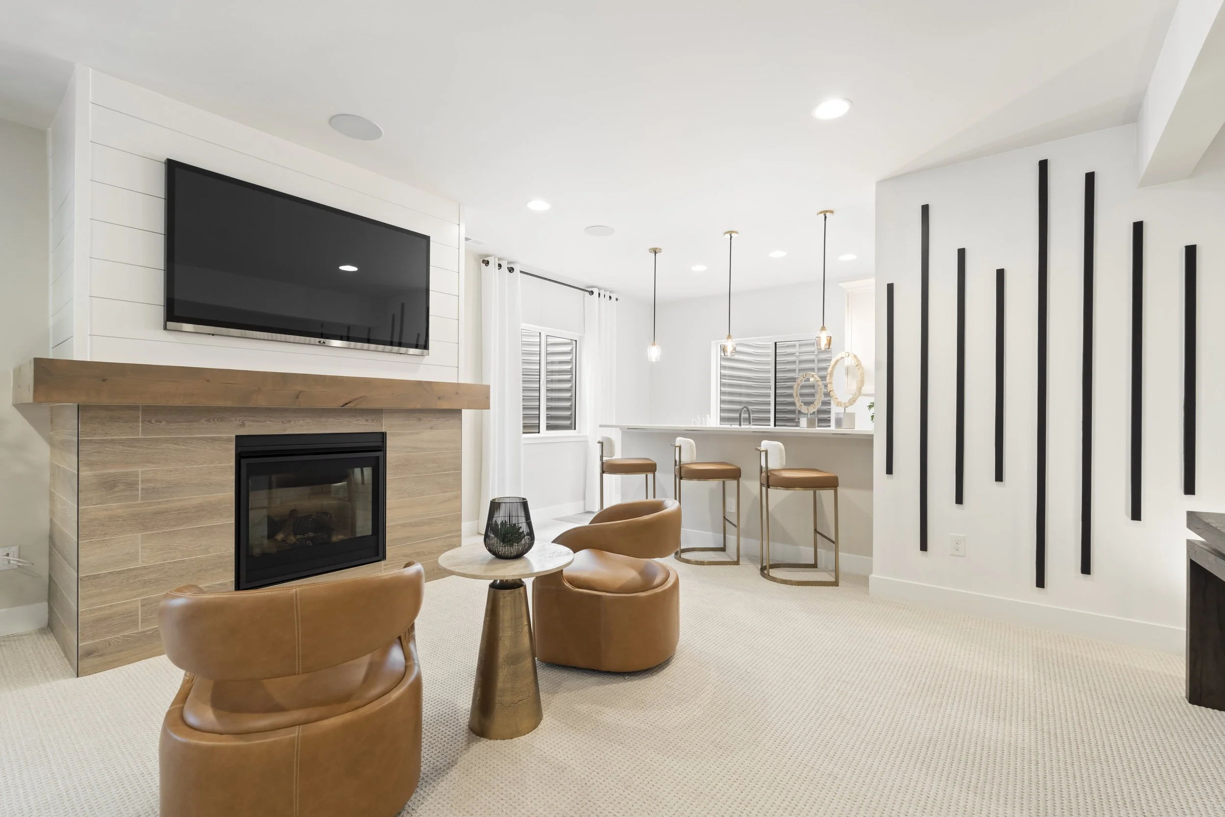 Fireplace Great Room: Heat n Glo Mezzo60 Firebox with Knotty Alder Partial Mantel and Bedrosians Tile Tumbled Ledger Mixed Beige